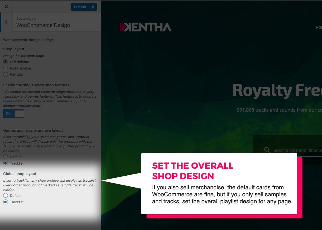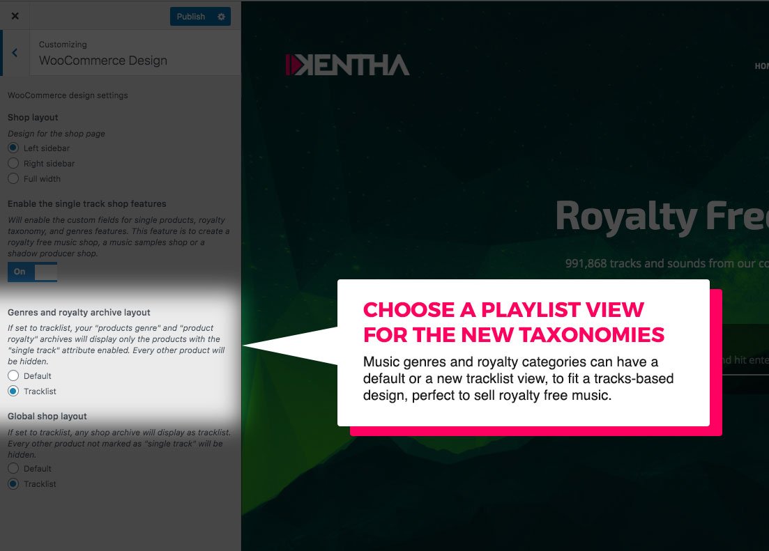 A new option has been added to the customizer, to enable the special “Single Track” features to your shop. Once enabled, you’ll have new shop layout available, new product custom fields like Sample file, MP3, Artist, and new taxonomies like Genre, Royalty Type and Software.