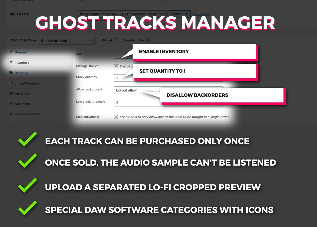 Once the “ghost track” is being purchased, it can stay visible in the shop, but its audio sample won’t be available, so nobody will know that the track is a ghost track from your shop! You can include in the downloadable content any project source file, audio sample or anything else you want!